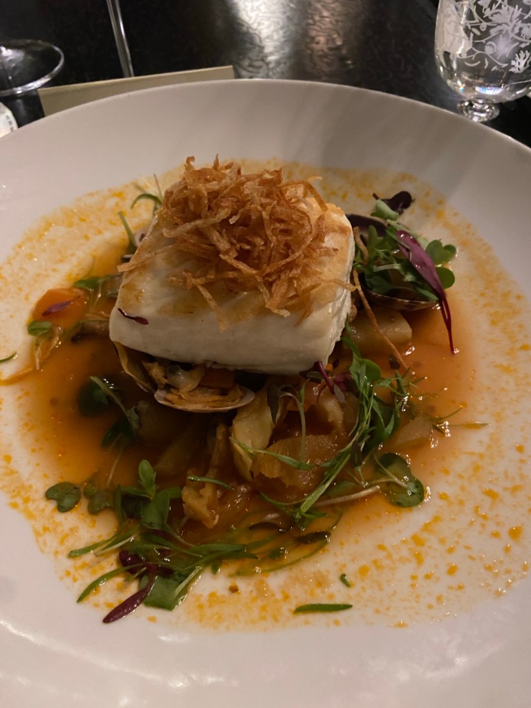 Halibut with a deconstructed Manhattan Clam Chowder. The halibut was cooked perfectly.