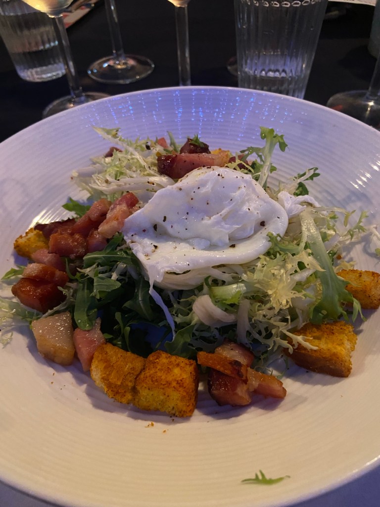 Appetizers: Salad Lyonnaise: Frisee Salad, Croutons, Poached Eggs. Paired with E.GUIGAL AOC Côtes du Rhône Guigal Rosé 2024 and Domaine de l’Amauve (SAS) AOC Côtes du Rhône Villages Séguret La Daurèle White 2023