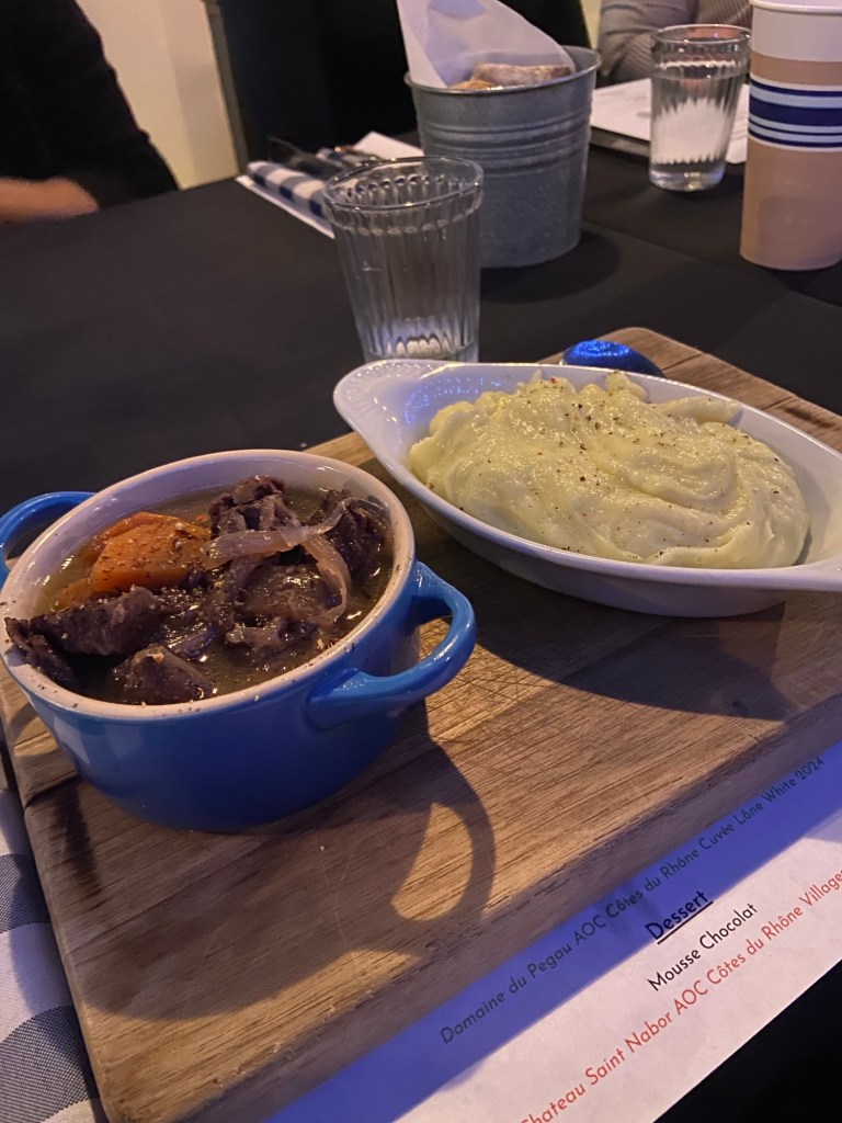 Entrées: Daube Provençale paired with Château Simian AOC Côtes du Rhône Villages Massif d’Uchaux JOCUNDAZ Red 2022 and Domaine Lucien Tramier AOC Côtes du Rhône Villages Plan de Dieu Red 2021
